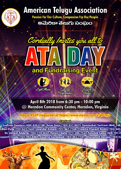 ATA DC chapter is hosting ATA Day and Fundraising Event on Sunday April 8 from 6.30pm at Herndon Community Center hall. This is in preparation for American Telugu Convention jointly hosted by American Telugu Association (ATA) and Telangana American Telugu Association (TATA) in Dallas from May 31 through June 2.